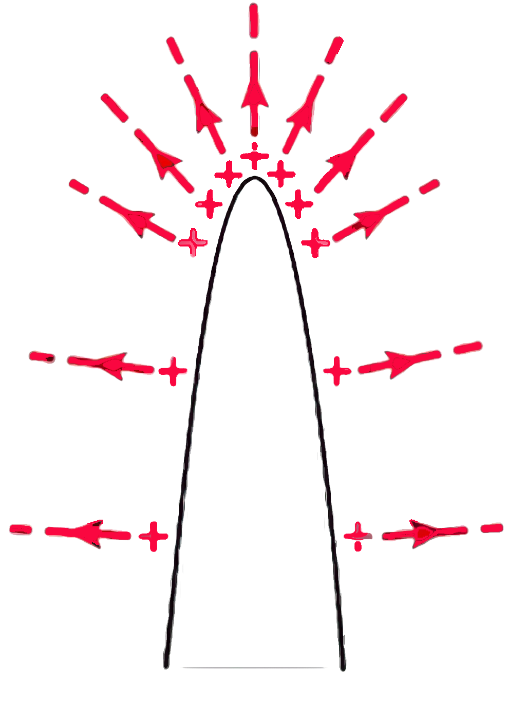 确实,避雷针的尖端能够电离周围的空气并使其更具导电性。尖头避雷针的电场相对于钝头避雷针强得多,但它随着距离的增加而下降得更快。在直径为20毫米的钝棒尖端上方几厘米处,电场强度大于在相同高度的更锋利的棒上的电场强度。所以,尖头避雷针尖端上方较强的导电性可能无法释放延伸数公里远的乌云。