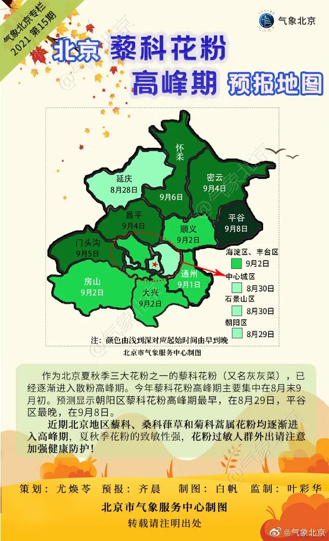 目前,这些服务产品,公众可以通过微博“气象北京”和微信公众号“花粉监测预报”、小程序“花粉健康宝”查看,非常便利。在花粉高峰期,上述产品还会在北京卫视天气预报节目、“气象北京”抖音上发布。