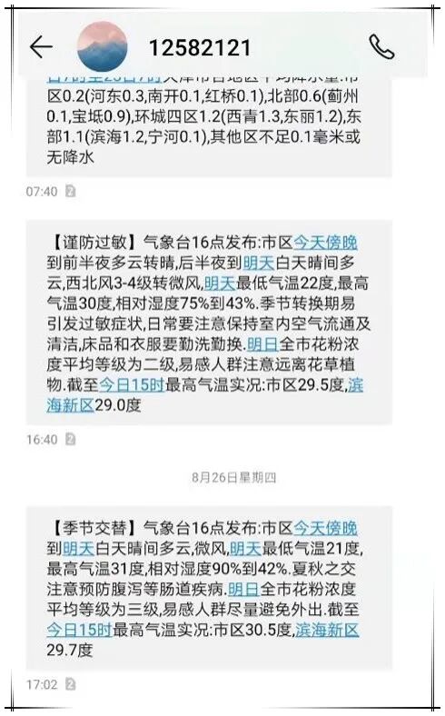 近期,天津市气象部门会在每日推送的天气预报短信中加入花粉预报,提示易感人群做好防护。同时,公众可在“天津气象”微博、微信、客户端等平台,查看前一日的花粉浓度实况和次日花粉指数预报。此外,公众还可通过“天津预警发布”抖音号和喜马拉雅音频号查看相关花粉浓度预报音视频节目。