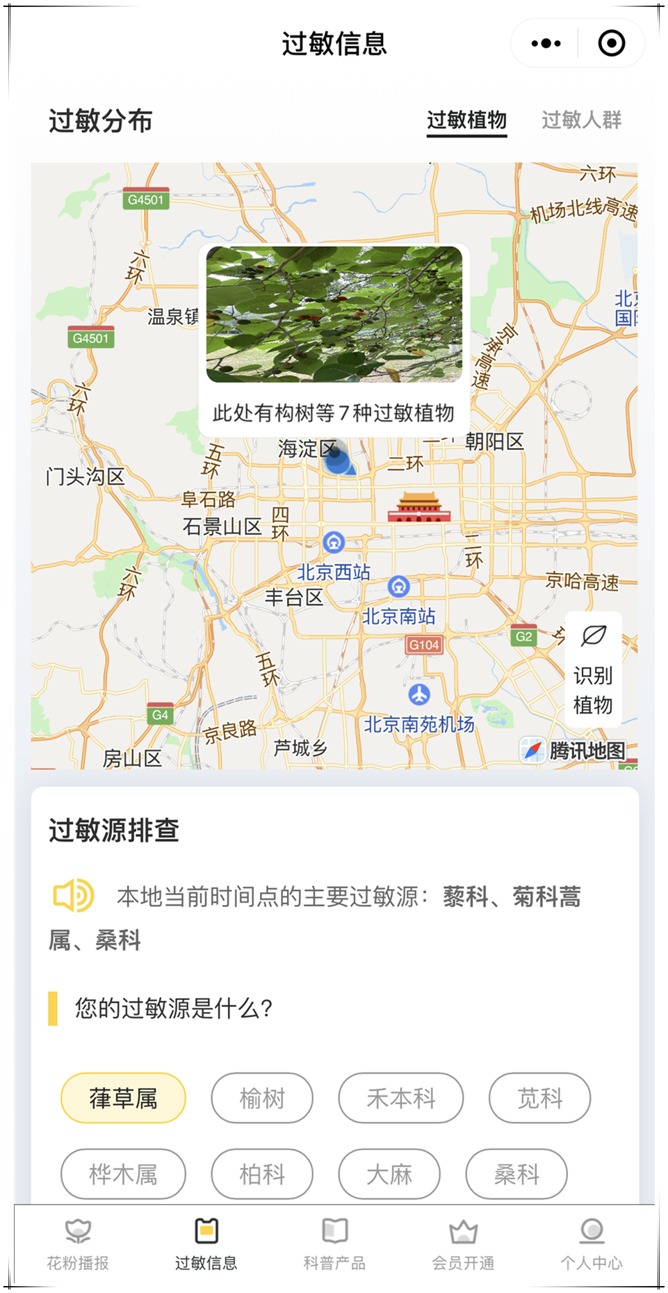北京地区气传致敏花粉主要来源于松科、柏科、杨柳科、菊科蒿属、桑科葎草属、藜科、禾本科,占花粉总数的90%以上。春季主要以柏科、杨柳科和松科为主,夏秋季也就是6月至10月主要有藜科、菊科蒿属和桑科葎草属。
