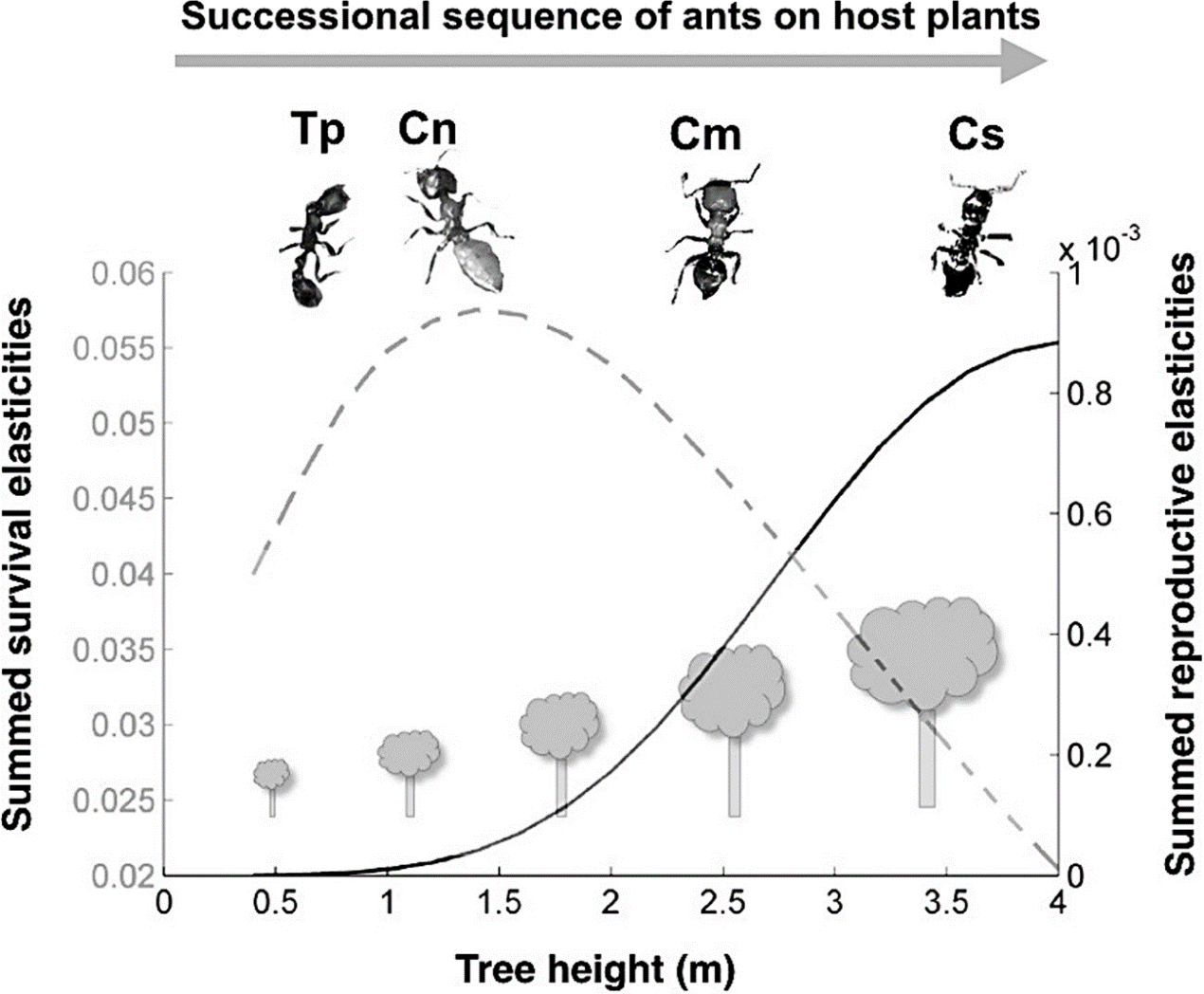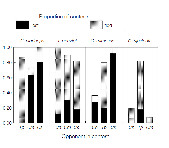 此外,让镰荚金合欢更占优势的是,它们的寿命比蚂蚁长多了!只要有一次机会,比如说火灾,让镰荚金合欢摆脱了蚂蚁,这种蚂蚁就会永远失去再次占领这棵树的机会,毕竟还有三种比它强得多的蚂蚁一直在虎视眈眈地盯着呢。
