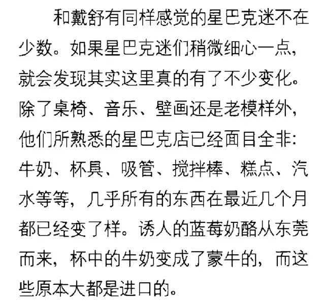 一句“原本都是进口的”,作者笔下的星巴克迷,俨然一个个都对国货过敏,只有靠“洋货”才能续命的玻璃人,愤慨地指责星巴克不断扩张污染了他们娇贵的优越感。