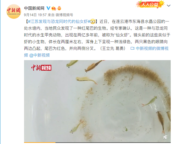最近,在江苏连云港市东海县水景公园的一处水塘里,有人发现了一种看起来很优雅的生物。经过确认,这是一种2亿多年就已经存在的生物,跟恐龙同时代,叫做仙女虾。