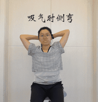 双手抱头,吸气的身体弯向右侧,感受身体左侧被完全拉开,吐气回正,反向同理,改善肩膀外展受限的同时,有效延展侧面胸背肌。