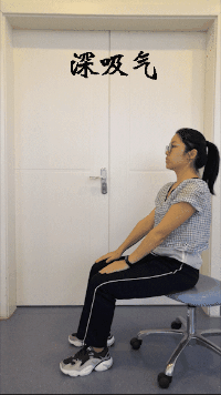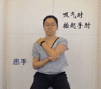 用患侧手拖住健侧的手肘,配合呼吸进行活动,吸气时前屈上举,呼气时回落,如此反复进行。