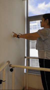 把双手放在墙上,从下往上爬墙,感受到不适时停下保持10s,双手放下回到原位,然后反复此动作,争取逐渐增大角度,越爬越高,最终做到两只手能够平齐达到最高点。
