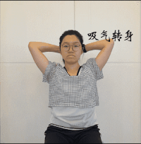 身体直立,两手交叉放于后脑勺,吸气时向右侧旋转,吐气回正,反向同理。此动作改善肩关节活动的同时可帮助打开胸廓,减少酸痛,改善圆肩现象。