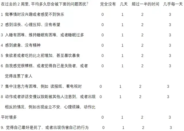 患者健康问卷-9(PHQ-9)是一种9项自我报告问卷,是初级保健中常用的抑郁症筛查工具,很容易掌握。美国临床肿瘤学学会也推荐了PHQ-9用来筛查肿瘤患者中的抑郁症状。