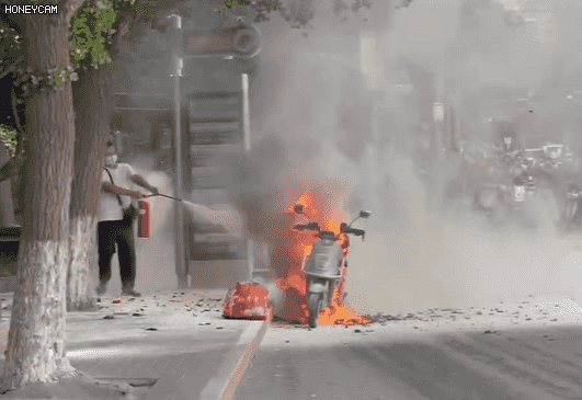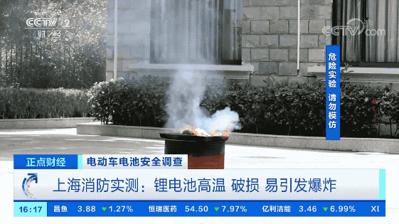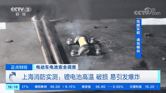 上海消防工作人员说,除了高温外,锂电池的破损、挤压也是引发电动自行车起火的重要原因。在临港新区的上海防灾救灾实验区内,工作人员将一根钢针匀速刺穿单芯锂电池,几秒钟后电池开始冒烟并伴有射流火,随后形成了爆炸。