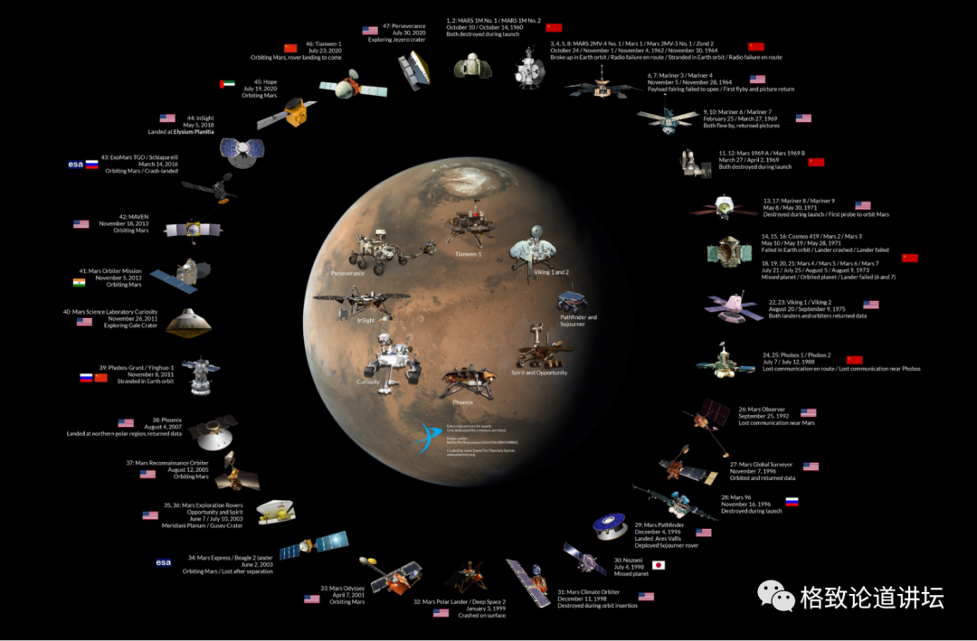 实际上我们不是第一个去火星的国家。在更早的时候,就已经有一些国家的航天器在火星的轨道上环绕和在火星的表面上降落,传回来了很多图片。