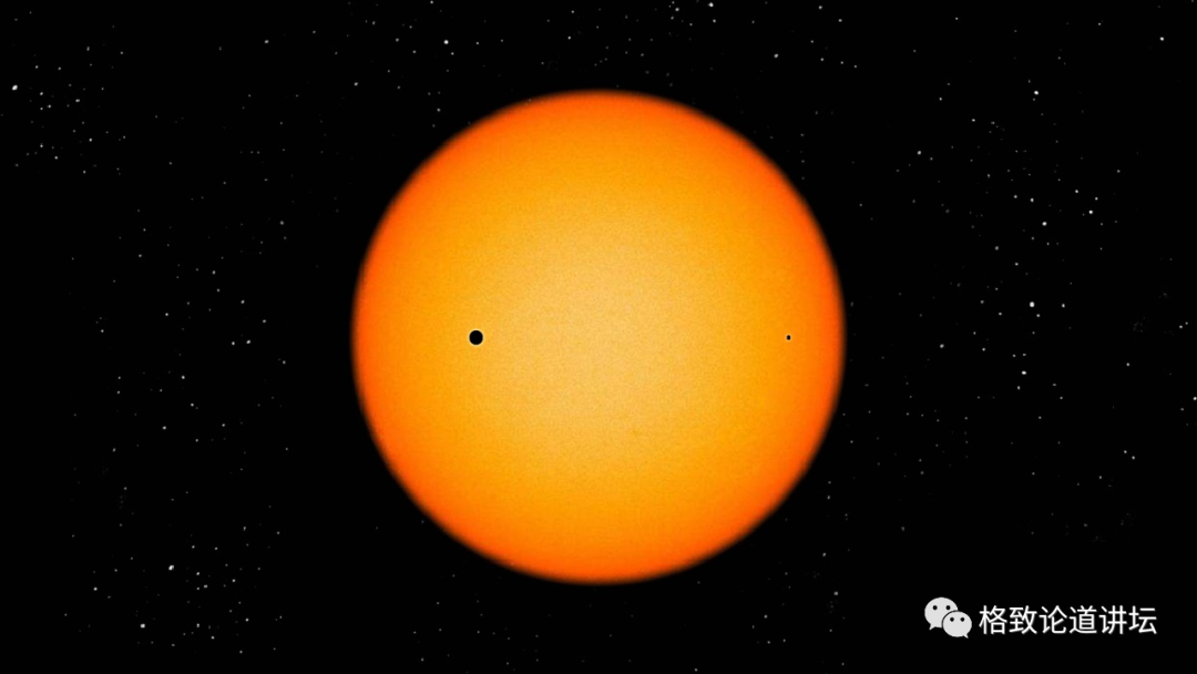还有一个百年一遇的天文奇景。相对于火星而言,地球属于内行星,所以难得一见的奇景就是看地月系统凌日。两个小点从太阳表面上缓缓滑过,大概三个小时左右的时间。有的时候比较远,会横跨整个太阳的表面(上图),也有的时候相对来说距离比较近(下图)。