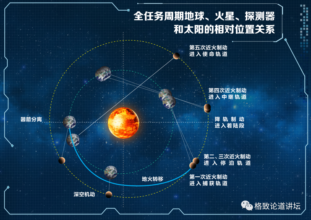 飞行的过程实际上就是绕着太阳转,探测器的运行轨道是一个椭圆的轨道,与地球和火星都有相交的对应点。这个轨道有个很著名的名字,叫做霍曼转移轨道,它是最省能量的轨道。