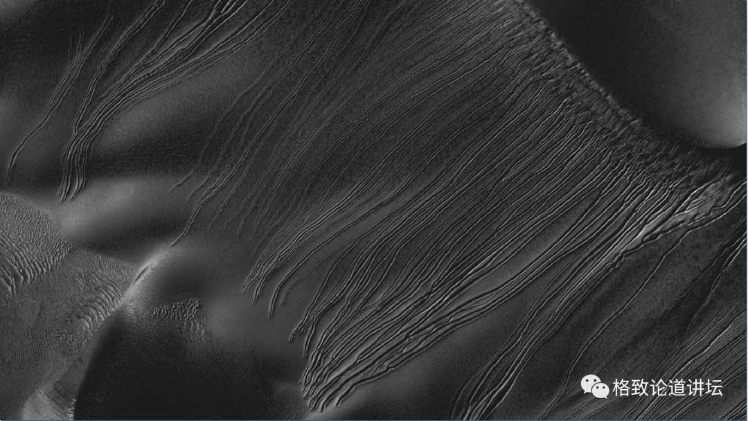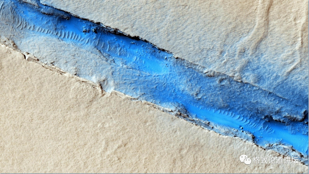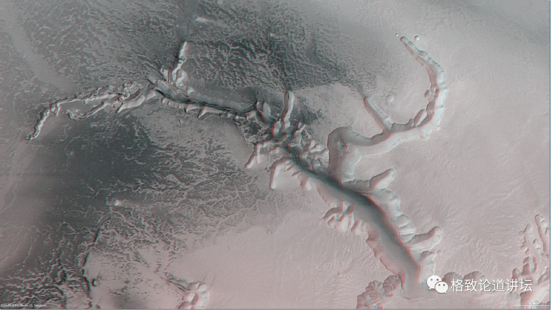 在火星的表面上,还有疑似过去的河谷。我在想,如果有一天我们能够改造火星,是不是可以把这里规划为一个景点,用来做漂流。