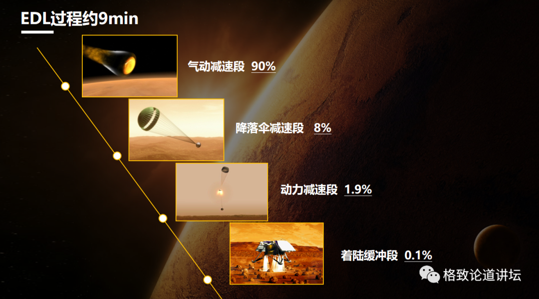降落的过程一共是9分钟左右,分成四个阶段。最开始的降落速度是每秒4公里到5公里之间,接近5公里。第一阶段是气动减速段,空气的阻力基本会减掉它90%的速度或者说99%的能量。