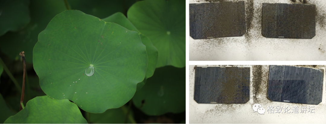 我们在电池片上也放了一种类似的工艺材料。从微观上看,我们把电池片的玻璃变成了一个有很多尖的针床,灰尘不是很踏实地落到表面上,而是落在针床上。在太阳翼运动的过程中,灰尘很容易滑落,电池片的表面就会比较干净和清洁。右图就是做实验时的效果展示。我们能够看到,有了这个工艺之后,只要把电池片立起来,它就会变得比较干净。