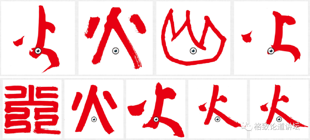 最开始我们的目光聚焦在第一排的第三个,是甲骨文的“火”字。这代表了文字起源之初,有五千年的文明历史,寓意很充沛。