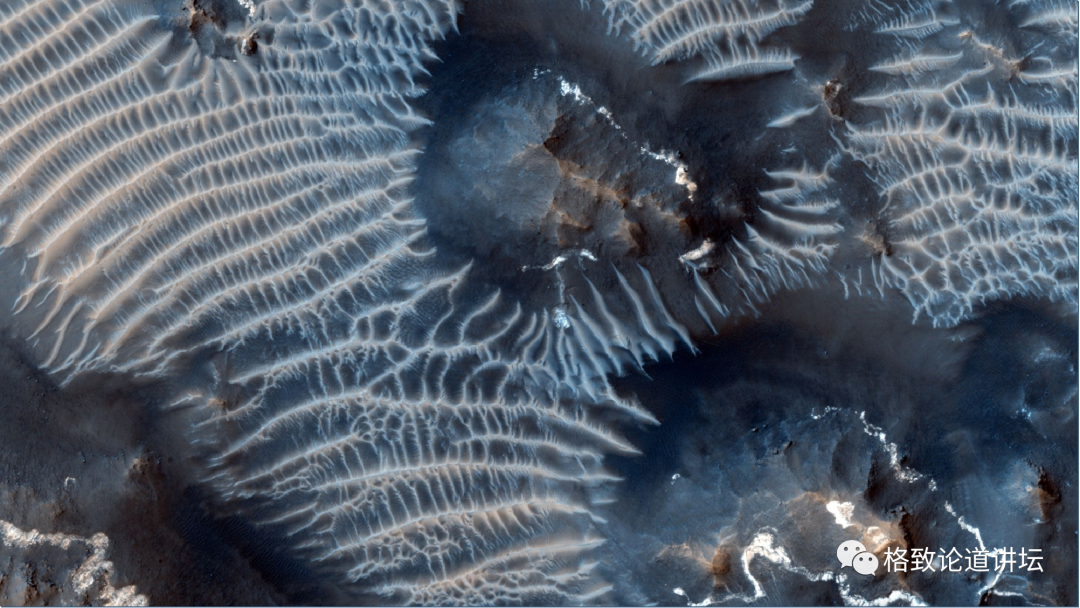 这张是我最喜欢的。通过把不同谱段的图像处理成伪彩,然后就形成了这样一张火星地貌的图片。