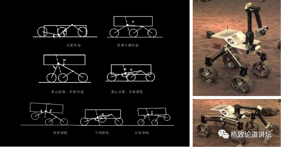 它的前轮向前行驶,中轮和后轮先不动,整个过程中车身降低;接下来前轮不动,中轮和后轮再向前行驶,过程中车身再抬高。这个过程就像一只小虫子在蠕动。这样做的好处就是它能够轻松地从沉陷的沙土地里走出来,因为火星车在火星上工作的时候没有4S店,也没有救援车辆。
