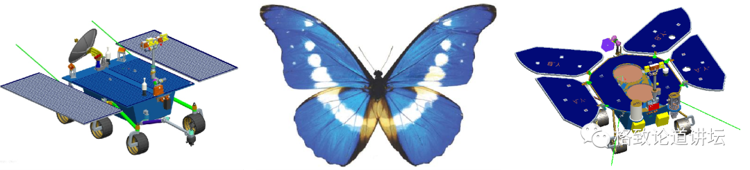 整个演化过程到了最后收官的时候,我们发现我们设计的火星车很像一只蝴蝶,而且是一只蓝色的闪蝶。为了证明我们的灵感来自于蝴蝶,我特意去网上买了一个蝴蝶标本,放在我的办公桌上。
