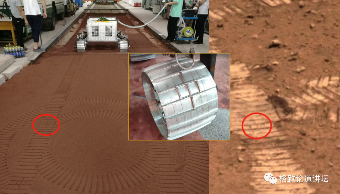在展示的时候,有的网友比较细心,看到了我们藏在火星车车轮上的一个小秘密。仔细看会发现,下面这张照片的车辙印能够看到“中”字。