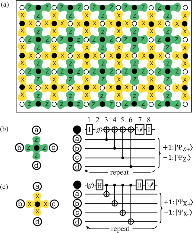 图6. 表面编码:目前最具实用性的量子纠错码。图(a)中的空心圆点为数据比特,实心(黑)圆点为纠错比特。通过一定的形式将信息编码到数据比特中,然后将数据比特与纠错比特〔以(b)和(c)中的形式〕纠缠起来并对纠错比特做测量,可以在不破坏数据比特信息的情况下,追踪它们是否发生错误,不断重复这样的过程,就能够持续的修正错误。