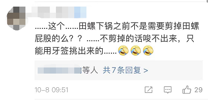 也有网友提出疑问 “田螺下锅前 难道不是需要剪掉田螺屁股的吗” 正常情况下 田螺需要剪掉螺尾才能下锅 虽然有些地方 烹饪田螺时不剪螺尾 但食用的时候 也不会直接用嘴吸 而是用牙签之类的工具 将螺肉挑出 吃东西是一件享受的事 但也要讲究技巧 不然容易惹麻烦