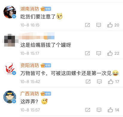 10月6日 山东济南一名女子在吃田螺时 不小心将螺壳吸在了嘴唇上 吸在了嘴唇上 嘴唇上 上 …… 自己折腾半天也无法取下来 反而将嘴唇扯得生疼 无奈之下 她只得顶着田螺 来到消防队寻求帮助 消防员查看后 一开始用棉签沾热水 试图借助热胀冷缩原理 将田螺取下 但失败了 没办法 那只能用小型工具将它磨透 …… 为了防止因为乱动而出现误伤 一名消防队员托住了女子的头 同时捏住了 那颗惹事的田螺 在一阵让人头皮发麻的电锯声中 田螺的外壳被打出一个小孔 失去负压的田螺 也松开了女子的嘴唇 田螺: 以前都是人嘬我们 这次我也嘬一次人 发生火灾要灭火,找消防员 熊孩子被卡,找消防员 戒指卡手拿不走,找消防员 …… 日常生活中 大家似乎都形成了一种默契—— “有困难,找消防员” 但面对这样的场面 消防叔叔表示 还真不多见