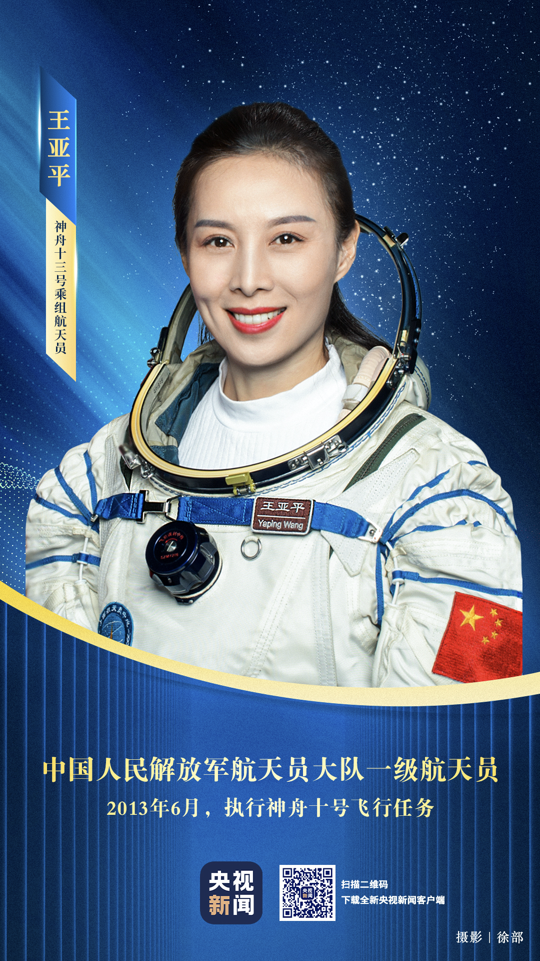 王亚平,女,汉族,籍贯山东烟台,中共党员,硕士学位。1980年1月出生,1997年8月入伍,2000年5月入党,现为中国人民解放军航天员大队一级航天员,大校军衔。曾任空军航空兵某师某团副大队长,安全飞行1567小时,被评为空军二级飞行员。2010年5月,入选我国第二批航天员。2012年3月,入选神舟九号飞行任务备份航天员。2013年6月,执行神舟十号飞行任务,同年7月,被中共中央、国务院、中央军委授予“英雄航天员”荣誉称号,并获“三级航天功勋奖章”。2019年12月,入选神舟十三号飞行任务乘组。