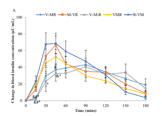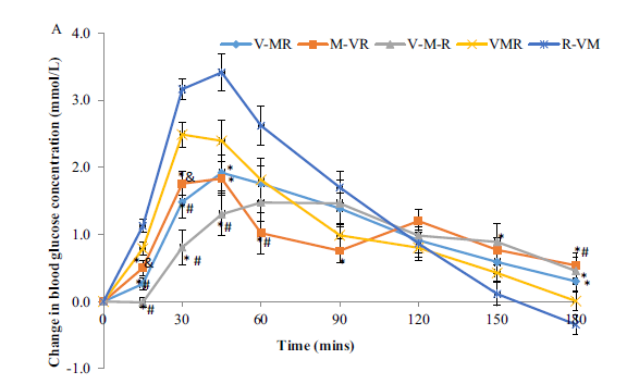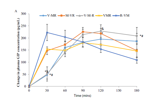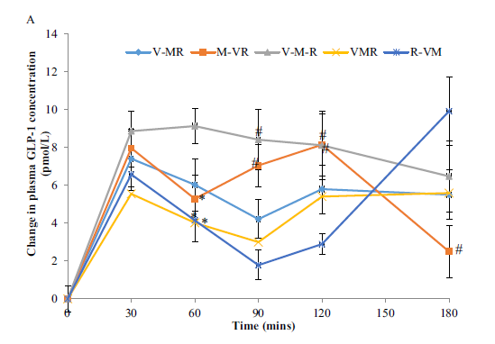 作者:范志红,袁雨晴(学生) 无论是糖尿病患者,需要减肥的人,还是想让脸上少长痘痘的人,「控糖」都是一个重要任务。控制好餐后血糖的意义有多大,这里就不多说了。 虽然也知道燕麦、藜麦、杂豆之类全谷杂粮是最好的控血糖主食,可是,大部分人由于各种原因,多数时候只能吃白米饭作为主食。谁都知道,白米饭是一种高血糖反应食物,血糖指数超过80[1]。 为了控制血糖而改变以精米白面为主食的饮食习惯,确实不那么容易,难道这么吃饭的时候,就没法让餐后血糖控制得好一些么? 以前我们曾经撰文说过,有研究数据证实,米饭+蔬菜+肉类+油脂的吃法,会比单吃米饭,米饭+蔬菜+炒菜油,或者米饭+肉+炒菜油的吃法,更有利于控制血糖[2]。比如说,米饭配上足够多的青菜和鸡肉一起吃,就是一种相对比较合理的吃法。 不过,这项研究仅仅建议人们多种食材配着吃,并没有说明,应当先吃什么,后吃什么。 新加坡的研究者决定探索一下,同样的餐食,如果吃的顺序不一样,餐后血糖反应会有什么差异,血糖相关的一些激素变化有什么不同[3]。 这项研究的食材,还是这个青菜鸡肉饭。其中包括: 米饭(用63.2g生米煮出来的),鸡肉(用100g鸡胸肉做的),青菜(用180g小白菜制成) 实验餐一共有5组,食材及摄入量完全相同,差别只是进食顺序不同。 第一组:先食用青菜,10分钟后食用肉类和米饭(V-MR); 第二组:先食用鸡肉,10分钟后食用蔬菜和米饭(M-VR); 第三组:先食用青菜,10分钟后食用肉类,再10分钟后食用米饭(V-M-R); 第四组:同时食用蔬菜、肉类和米饭(VMR); 第五组:首先食用米饭、10分钟后食用蔬菜和肉类(R-VM)。 大家猜一猜,哪一种吃法是血糖反应最低的呢? 结果是这样的: R-VM处理,也就是先吃米饭这一组,餐后血糖反应是最高的。 第二高的,就是VMR组,也就是蔬菜、肉类和米饭你一口我一口同时吃。这就是我们日常吃饭时所习惯的吃法。 在吃碳水化合物(米饭)之前,无论是M-VR(先吃肉类,然后米饭蔬菜混着吃),还是V-MR(先吃蔬菜,然后肉类米饭混着吃),或者V-M-R(先吃蔬菜,再吃肉,最后吃米饭),都可以有效地减弱血糖反应。 这三个吃法,从餐后血糖曲线的面积,或一餐饭的血糖指数(GI)值来评价的话,效果差不太多,没有显著差异。但是,从血糖波动的幅度来说,明显是蔬菜-肉-米饭这一组峰值最低,波动最小。很多研究证实,血糖波动小,才是最有利于控制体重,也最有利于预防多种慢性疾病的。 那么,从代谢调节来说,先吃肉类,和先吃蔬菜,以及蔬菜-肉-米饭的顺序相比,哪一组更好呢?虽然血糖反应方面差异不那么明显,但是激素反应还是有差异的。 研究者测定了餐后各点血液中胰岛素、GIP 和 GLP-1 三种和血糖控制和饱腹感相关的激素变化,绘制出曲线。 比较胰岛素的变化,还是先吃米饭这一组波动最大。 同样,还是蔬菜-肉-米饭这一组峰值最低,波动最小。 先吃蔬菜这一组,峰值也比较低。而先吃肉这一组,峰值就高多了,和吃米饭这一组不相上下。 一起吃那一组,则介于其间。 如果血糖值降了,但胰岛素水平升高了,那就说明胰岛素敏感性并没有提高。反之,如果血糖峰值不变甚至低了,而胰岛素水平也低了,那就说明胰岛素敏感性提升了!毫无疑问,先吃蔬菜对提高胰岛素敏感性起到了极好的作用! 然后比较 GLP-1(胰高糖素样肽-1)的变化。先科普一下,这种胃肠激素是在小肠下段产生的。 它能延缓胃排空和肠道运动,抑制胃酸分泌,降低食欲,帮助提升饱腹感,有利于减肥瘦身。它既能促进胰岛素,又能抑制胰高血糖素,非常有利于血糖水平的稳定。 刚吃饭的时候,GLP-1 都会迅猛上升,各种吃法都差不多。不过比较有趣的是,后面就不一样了。先吃米饭的吃法,是先下降,后上升;先吃肉的吃法,则是先波动上升,后下降,和米饭趋势基本上相反。一起吃时,全程都比较低一些。 蔬菜-肉-米饭的吃法表现最佳,可以全程稳定保持 GLP-1 高水平。这个结果提示, 这种进食顺序可以延缓消化速度,让营养素的释放缓慢而平稳,直到小肠末端都有食物被吸收。 最后看看GIP(葡萄糖依赖性促胰岛素样多肽)的变化。这种胃肠激素是在小肠上段产生的,它和 GLP-1 齐名,既能抑制胃酸分泌,促进肠液分泌,促进胰岛素分泌,也有利于血糖稳定。 先吃米饭的时候,GIP 上升特别猛,可能是因为小肠上段吸收的葡萄糖很多。但是,葡萄糖吸收得差不多了,后期 GIP 就会持续下降。 先吃肉,或者肉菜饭一起吃的时候,GIP 上升会慢一点,逐渐到达高峰,然后再下降。这说明,这些吃法一定程度上延缓了葡萄糖的吸收速度。 蔬菜-肉-米饭的吃法,开头 GIP 的上升特别缓慢,但是后程发力,餐后2-3小时还能稳定保持高水平。同样说明这种吃法非常有效地延缓了胃排空,延长了食物排放到小肠的时间。这样吃,同样的饭菜,餐后当然就更不容易饥饿啊。 真是不比不知道,进食顺序真奇妙! 最后,还是帮大家划个重点! 先食用蔬菜,然后食用蛋白质,最后吃高血糖反应的碳水化合物,对餐后血糖的控制效果是最好的。不仅有利于控血糖,对减肥也是很有帮助的。 哪怕先吃蔬菜,肉和饭一起吃,也比先吃饭的效果好。 这不就是我科普了好几年的控糖减肥进食顺序吗...... 先吃蔬菜和蛋白质后吃饭的措施,是由日本营养学家首先提出并推广的[4]。只不过,这次新加坡科学家的研究,把顺序组合做得更加精准,并进一步验证了其中的激素变化模式。 各国血糖管理方面的专家指南,都