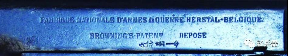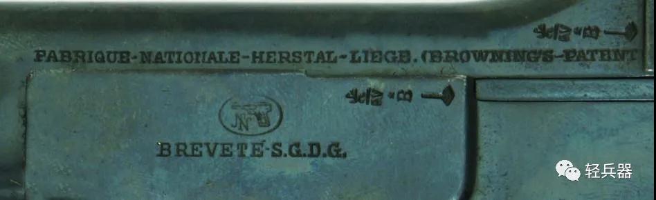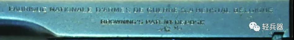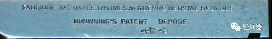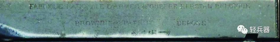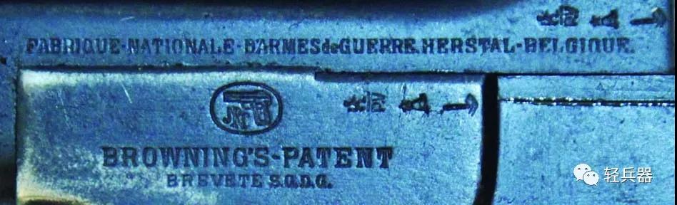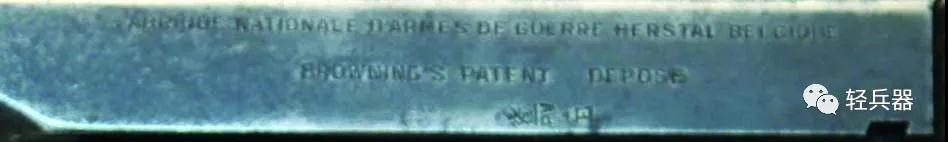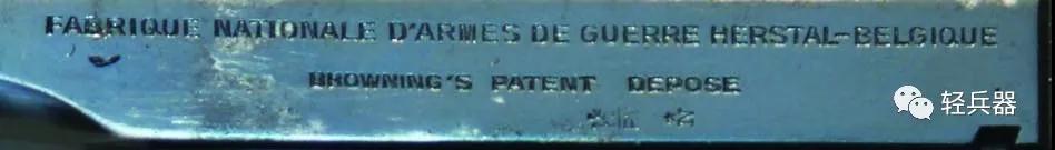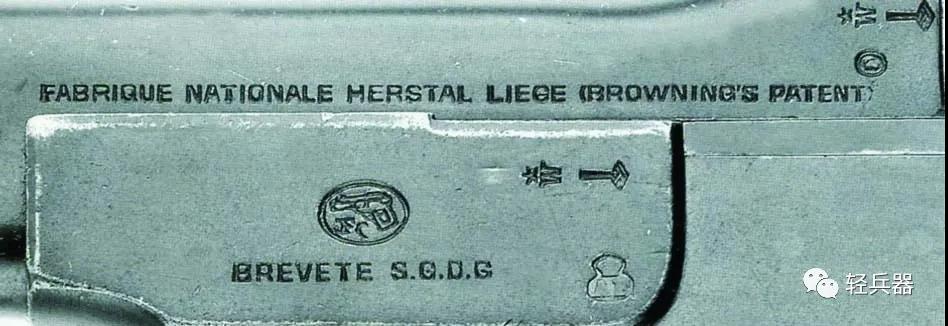 前两种铭文出现在1907年以前生产的枪支上,内容是一样的,铭文分为两行,第一行刻印在套筒上:FABRIQUE NATIONALE HERSTAL LIEGE (BROWNING’S PATENT) 或FABRIQUE-NATIONALE HERSTAL LIEGE (BROWNING’S PATENT)。可见,一种铭文中的FABRIQUE与NATIONALE之间为空格,一种铭文这两个词之间为短横线,译成中文为“赫斯塔尔国家兵工厂,列日(勃朗宁专利)”。第二行刻印在套筒座上:BREVETE S.G.D.G.(S.G.D.G.是San Garantie Du Governement的缩写)或BREVETE-S.G.D.G。可见,一种铭文BREVETE与S.G.D.G.之间为空格,一种为短横线。这句铭文译成中文为“该枪获得专利保护”。这种细微差别,不仔细观察很难发现。