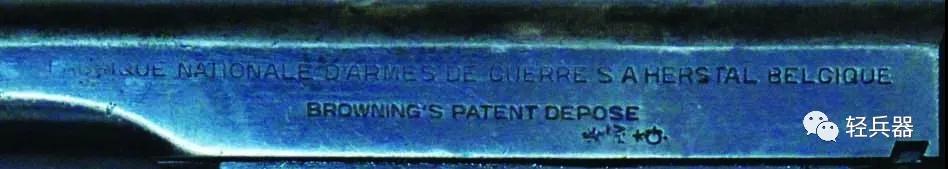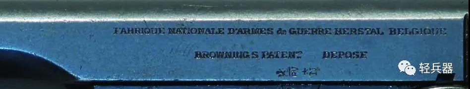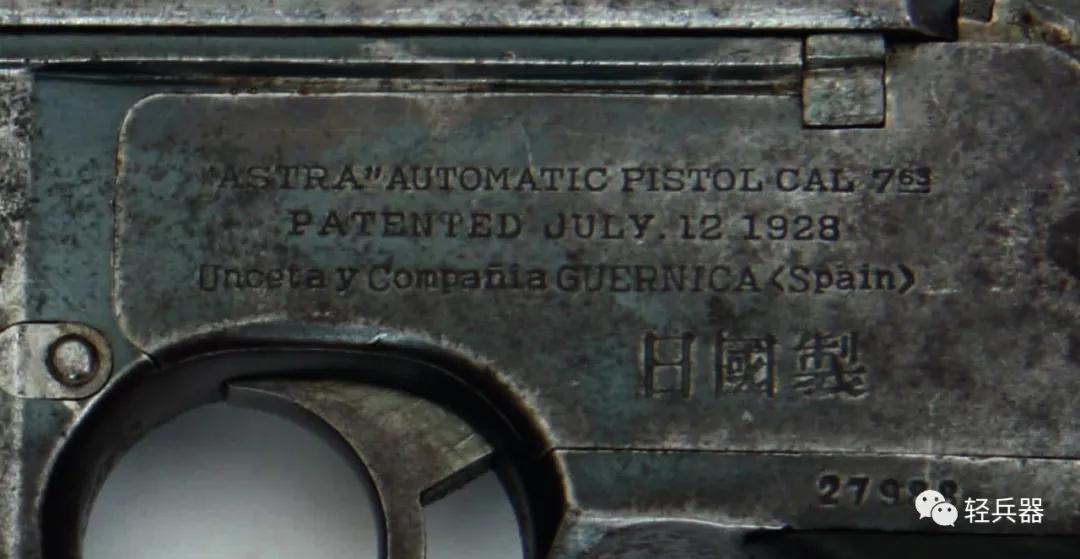 枪身铭文特写。铭文用英文和西班牙文标注了阿斯特拉自动手枪、枪支口径、获得专利时间及西班牙温塞塔公司等内容,又在下面标注了3个较大的汉字“日国制”