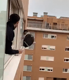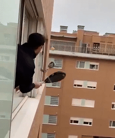 视频中可以看到,两个意大利老哥探出窗外,一人一球拍就玩上了。