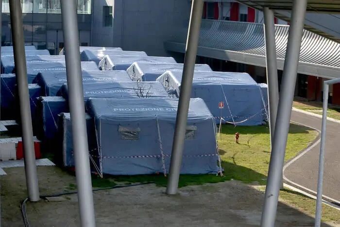 这些帐篷一般就建在意大利各地的医院旁边,充当诊断、隔离和收容患者的作用。内部配有照明和电源插座,还有加热功能,一个帐篷可以容纳四个人。