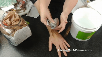 比较绝活的是她还来了一场现场试验,将不明棕色物体涂在了实验人员的手臂上,然后准备用破布擦拭: