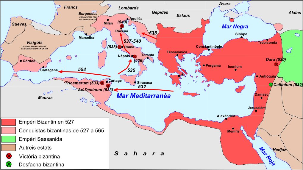 · 东罗马帝国全盛时的领土,征服了原属于罗马的达尔马提亚、意大利、北非、西班牙东南部、西西里、撒丁尼亚、科西嘉和巴利阿里群岛,但仍与皇帝的期望相距甚远,特别是高卢独立于「罗马」之外