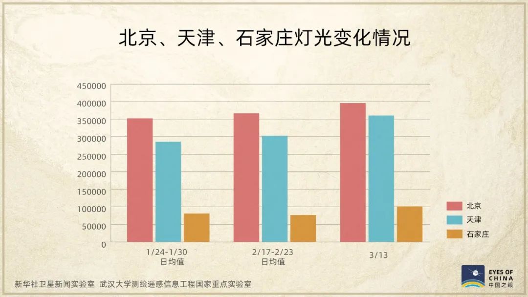 这是3月13日京津冀地区夜间灯光分布情况。在全力做好北京疫情防控工作、维护首都安全稳定的大背景下,京津冀地区夜间灯光亮度仍达到春节期间的1.28倍。