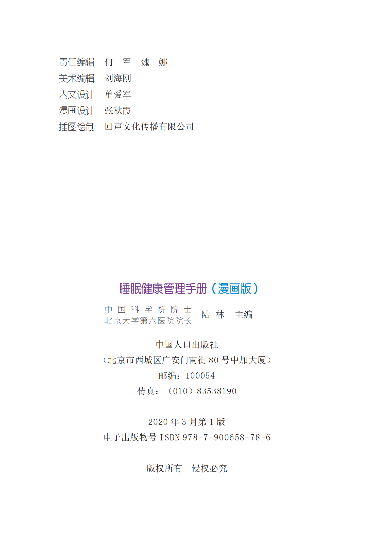 主编专家 · 陆林 · 陆林,中国科学院院士,医学博士,博士生导师,北京大学第六医院院长/北京大学精神卫生研究所所长、国家精神心理疾病临床医学研究中心主任、中国疾病预防控制中心精神卫生中心主任。 睡眠健康管理手册(漫画版)